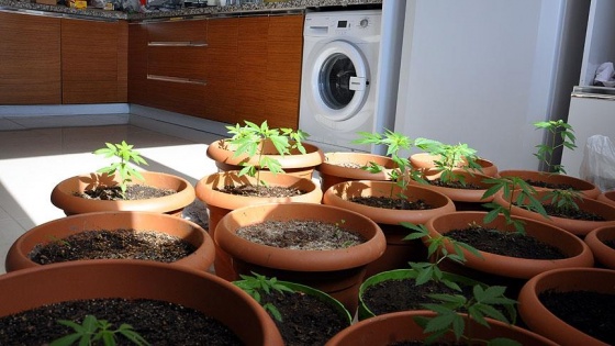 Kayseri'de düzenlenen operasyonda lüks dairede saksılara ekili çok sayıda Hint keneviri bulundu, 15 şüpheli gözaltına alındı.