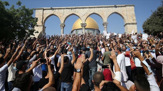 Kubbet'us Sahra'nın önünde bir süre eylemlerini sürdüren Filistinlilerin, İsrail'in yanı sıra Birleşik Arap Emirlikleri ve Suudi Arabistan karşıtı sloganlar da atması dikkati çekti.
