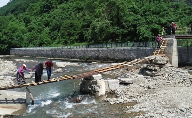 Trabzon’un Araklı ve Sürmene ilçeleri arasından geçen Küçükdere çayı güzergahında bulunan Sürmene’nin Aşağı Çavuşlu mahallesini karayoluna bağlayan köprünün sel suları nedeniyle yıkılması üzerine ilkel yöntemlerle yapılan köprüden geçen vatandaşlar korku dolu anlar yaşıyor. Tahtadan yapılmış köprünün altında geçen dere sularına kapılmaktan korkan mahalle sakinleri, normal yolda bile yürümekte zorlanan yaşlı insanların derme çatma bir köprünün üzerinde geçerken adeta hayatta kalma mücadelesi verdiğini belirtiyor.