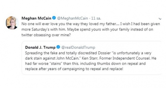 ABD Başkanı Donald Trump, sosyal medya hesabından yaptığı açıklamada, Rusya dosyasının Ağustos ayında hayatını kaybeden Senatör John McCain için “kara bir leke” olduğunu ifade etmişti. Bir dönem başkan adayı olarak Barack Obama'ya karşı yarışan senatörün kızından Trump'a yanıt gecikmedi. McCain'in kızı Meghan McCain, Trump'ın McCain ailesi ile uğraşmak yerine Cumartesi gününü kendi ailesiyle geçirmesi gerektiğini ifade ederek, “Kimse babamı sevdiği kadar Trump'ı sevmeyecek” dedi.