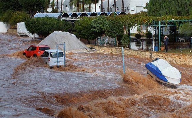 Atakent Mahallesi'nde Kuruçay Deresi'nin taşması sonucu bölge su altında kaldı. Akıntıya kapılan ve denize sürüklenen park halindeki 2 araç bir demire takılınca durdu.