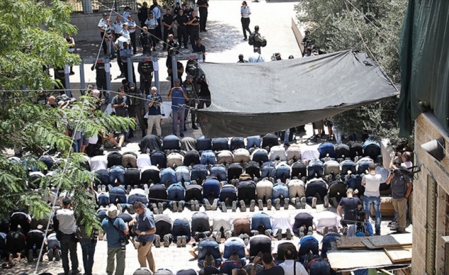 İsrail'in uygulamasını protesto eden grup, öğle namazını kapının Mescid-i Aksa'nın önünde kıldı.