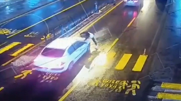 Görüntüde, V.S'nin yaya öncelikli geçitte beklediği, yaklaşan otomobilin üzerine atlayıp düştüğü görülüyor.