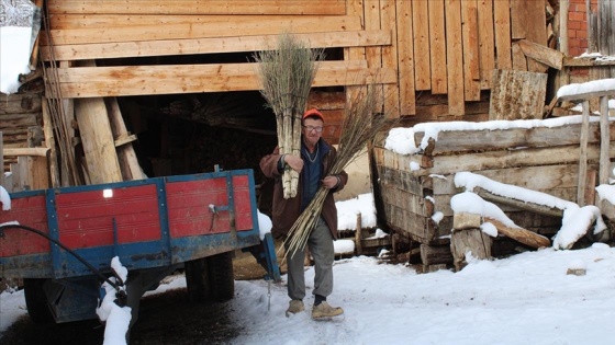 Ormandan toplanan çalılar 'Durmuş usta'nın elinde süpürgeye dönüşüyor