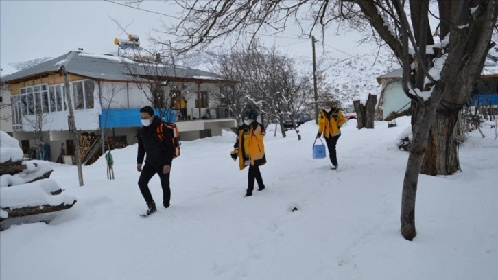 Karla kaplı yollardan ve derelerden geçen ekipler, yaklaşık 1 saatlik yolculuğun ardından köye ulaştı.