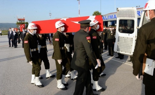 Şehidin Türk bayrağına sarılı tabutu askeri uçaktan tören mangasınca alınarak ambulansa kadar omuzlarda taşındı.