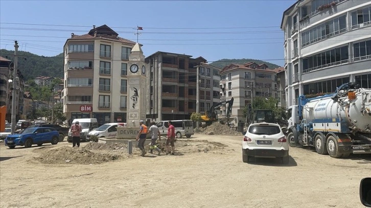 İlçede 9 Temmuz'da sağanak sonrası yaşanan su baskınlarının ardından çamur ve molozlarla dolan cadde ve sokaklar, ekipler tarafından temizleniyor.