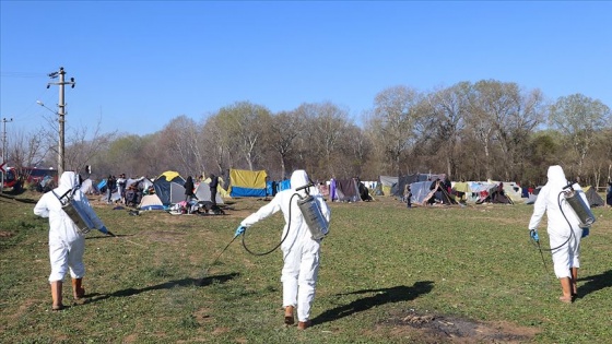 Edirne Sağlık Müdürlüğünün özel kıyafet giyinen görevlileri tarafından, sığınmacıların kaldığı çadır ve çevresi dezenfekte edildi.