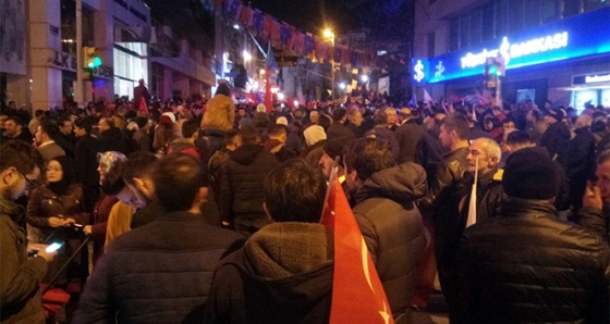 Ellerinde Türk bayrakları, AK Parti ve MHP bayraklarıyla AK Parti İlçe Teşkilatı binası önüne gelen vatandaşlar, kutlama yapıyor.