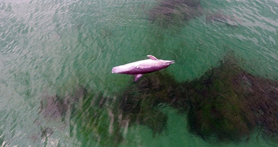 Başta bakıldığında ne olduğu tam anlaşılamayan ancak havadan yapılan çekimlerle yavru yunus balığı olduğu anlaşılan yunusun kuyruğunun kopuk olduğu belirlendi.