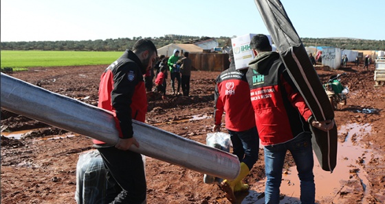 Suriye'de 3 gün önce başlayan yoğun yağmur yağışının sele dönmesiyle İdlib ve Lazkiye kentlerindeki çadır kent ve kamplar sular altında kaldı. Selin etkisiyle çadırsız kalan 200 aileye İHH İnsani Yardım Vakfınca gıda kolisi, sünger yatak, battaniye ve halı yardımında bulunuldu.