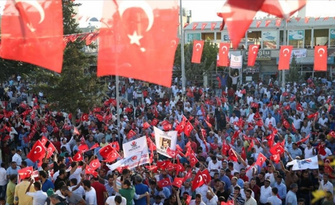 İlçedeki sivil toplum kuruluşları tarafından organize edilen etkinlikte Atatürk Meydanı'nda toplanan binlerce kişi, ellerindeki Türk bayraklarıyla, "Şehitler ölmez, vatan bölünmez", "Kahrolsun PKK", "Vekile uzanan eller kırılsın" şeklinde slogan attı.
