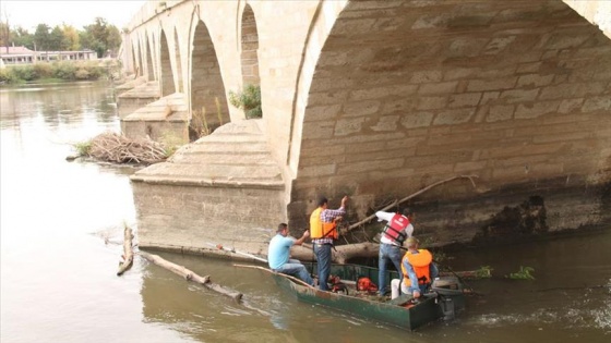 Edirne'deki tarihi Meriç Köprüsü'nün ayaklarında biriken ağaç dalları temizlendi.