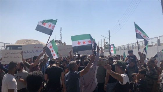 Türkiye sınırındaki Azez ilçe merkezinde cuma namazından sonra toplanan Tel Rıfatlılar, Babüsselame sınır kapısı önünde evlerini işgal eden terör örgütü YPG/PKK ve İdlib'i bombalayan Esed rejimini protesto etti.