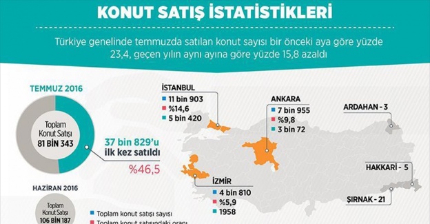 Türkiye genelinde ilk defa satılan konut sayısı, temmuzda geçen yılın aynı ayına göre yüzde 13,3 azalarak 37 bin 829 oldu. Toplam konut satışları içinde ilk satışın payı yüzde 46,5 olarak belirlendi. İlk satışlarda İstanbul 5 bin 420 konut satışı ile en yüksek paya (yüzde 14,3) sahip olurken, İstanbul’u 3 bin 72 konut satışı ile Ankara ve bin 958 konut satışı ile İzmir izledi. İkinci el konut satışları geçen yılın aynı ayına göre yüzde 17,8 azalışla 43 bin 514 olarak gerçekleşti.