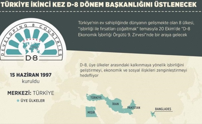 İstanbul'da 20 Ekim'de "İş Birliğiyle Fırsatları Çoğaltmak" temasıyla düzenlenecek "D-8 Ekonomik İşbirliği Örgütü 9. Zirvesi" ile D-8 dönem başkanlığı, ikinci kez örgütün "fikir babası" Türkiye'ye geçecek.