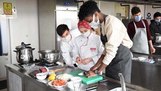 Uluslararası öğrencilerin verdiği tarifleri onlarla pişiren turizm lisesindeki arkadaşları, özellikle yeni tip koronavirüs (Kovid-19) nedeniyle ülkelerine gidemeyenlerin "anne yemeklerine" özlemini gideriyor.