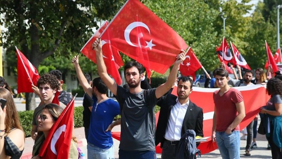 Atatürkçü Düşünce Topluluğu öncülüğünde 27 öğrenci topluluğunun desteğiyle Ege Üniversitesi Yerleşkesi'nde bir araya gelen öğrenciler, "Şehitler ölmez vatan bölünmez", "Kahrolsun PKK", "Atatürk gençliği görev başında" şeklinde slogan attı.