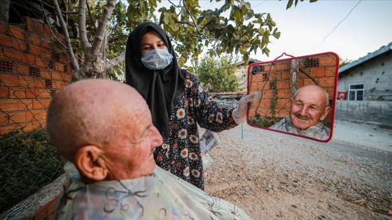 Evlerinin önünü adeta açık hava berber salonuna çeviren genç kız, salgın nedeniyle ilçe merkezine gidemeyen "dedelerin" ücretsiz olarak saç ve sakal tıraşlarını yapıyor.