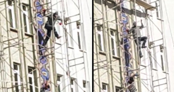 İstanbul’da 6 katlı bir binanın dış cephe düzenlemesinde çalışan işçilerin hiçbir tedbir almadan adeta ’Örümcek Adam’ gibi inşaat iskelesinden aşağıya inmesi yürekleri ağızlara getirdi. İşçilerin rahat bir şekilde hızla indiğini gören vatandaşlar şaşkına döndü. İşçilerin hayatlarını hiçe sayarak kontrolsüz bir şekilde demirlerden aşağıya inmesi korkuya neden oldu. İşçiler sağ salim bir şekilde aşağıya inmeyi başarırken korku dolu anlar ise çevredeki vatandaşlar tarafından cep telefonuyla kaydedildi.