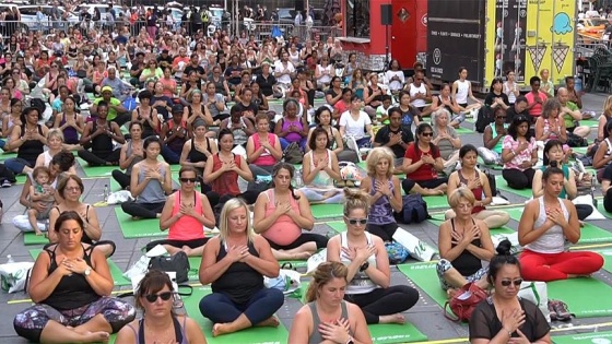 New York'ta, Dünya Yoga Günü dolayısıyla yüzlerce kişi Times Meydanı'nda yoga yaptı.