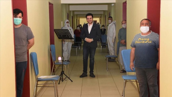 Karantinadakilere moral vermek için koridorlardan eserlerini seslendiren Gider'e, yurt misafirleri de odalarının kapılarında, sosyal mesafeyi koruyarak alkışlarla eşlik etti.