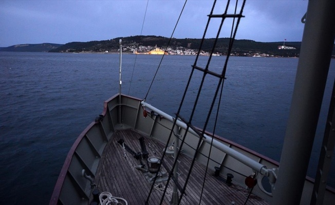ÇANAKKALE(AA) - Çanakkale Deniz Müzesi Komutanlığı Yüzer İskelesi'nde demirli bulunan "TCG Nusret (N-16)", mayınlarını döktüğü rotada ilerledi.