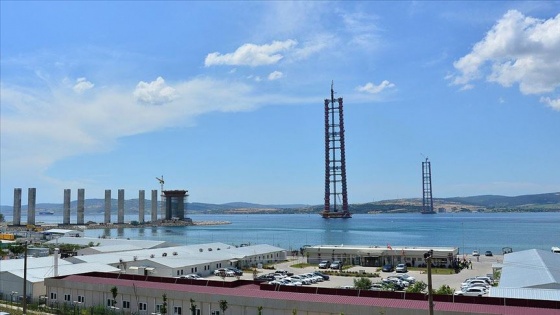 Çanakkale Boğazı'nda, geçen ay kulelerinin yapımı tamamlanan "dünyanın en büyük orta açıklıklı asma köprüsü"nde inşaat çalışmaları aralıksız sürüyor.