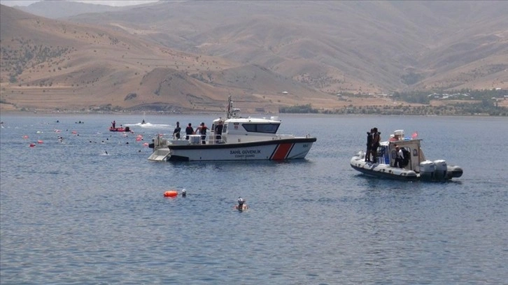 Burada hazırlıkların ardından suya atlayan yüzücüler, Van Gölü'nde yaklaşık 4,5 kilometre kulaç atarak Gevaş'taki Akdamar İskelesi'ne kadar yüzdü.