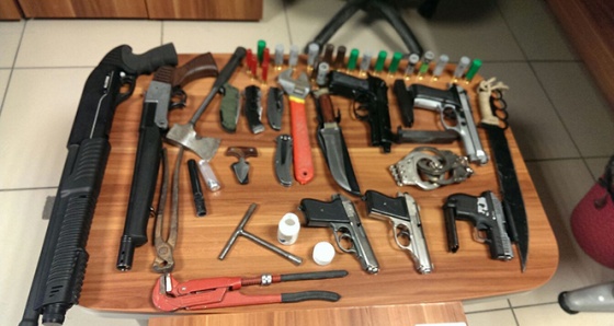 Polisin evde yaptığı arama sonucunda 2 adet ruhsatsız tüfek, 4 adet kurusıkı tabanca, 1 adet glock marka ruhsatsız tabanca, 6 adet delici ve kesici alet, 2 adet çalıntı motosiklet, 50 adet sentetik uyuşturucu hap, 5,8 gram metanfetamin, 2 adet uyuşturucu tartımında kullanılan hassas terazi, 1 adet çalıntı araca ait ruhsat ve anahtar ele geçirildi.