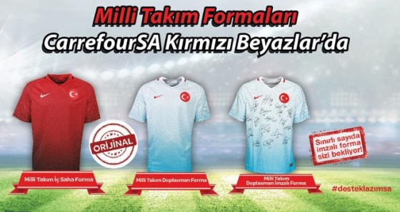 Fransa'da düzenlenecek 2016 Avrupa Futbol Şampiyonası (EURO 2016)için üretilen 60 bin lisanslı Milli Takım tişörtü, iç saha ve dış saha orijinal formaları ile futbolcuların imzalarının yer aldığı sınırlı sayıda forma, gıda perakendecisi olarak sadece CarrefourSA Kırmızı Beyazlar’da satılacak. Milli takımlar perakende tedarikçisi CarrefourSA,“Kırmızı Beyaz” adıyla mağazalarında açılacak satış noktalarında 2016 Avrupa Futbol Şampiyonası (EURO 2016)için hazırlanan özel ürünleri satışa sunuyor.