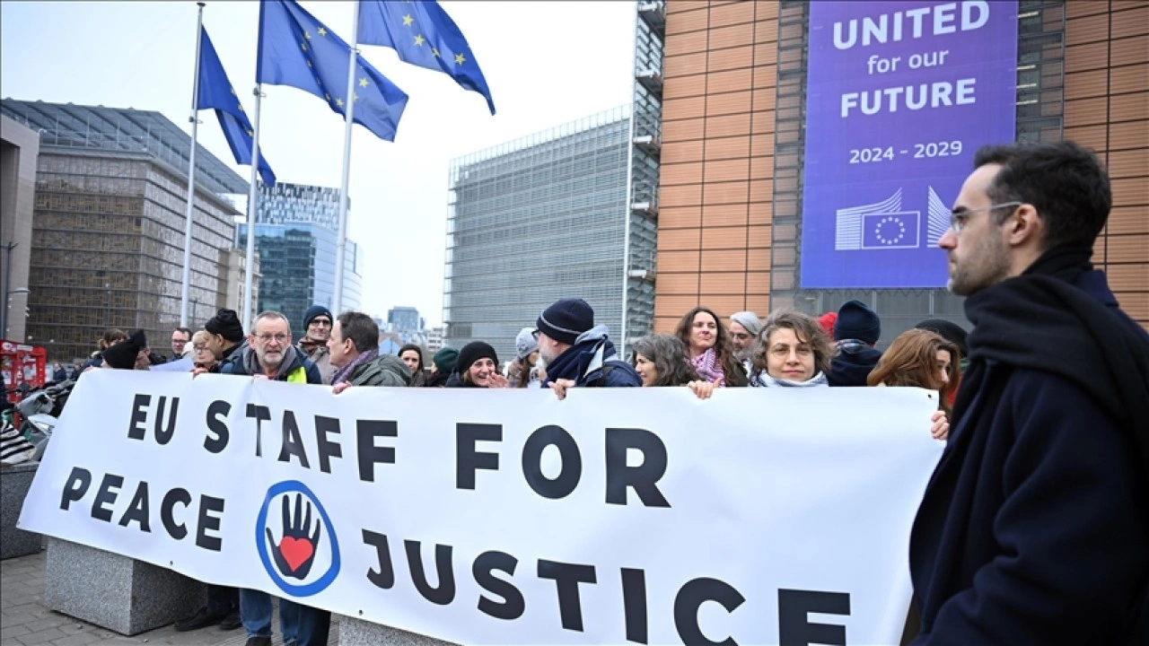 Daha önce de Birliğin İsrail'in Gazze'ye yönelik soykırımı karşısında sessizliğine karşı da bir araya gelen çalışanlar, bu kez 24 Şubat'ta yapılacak AB-İsrail Konseyi Toplantısı'nı protesto etti.