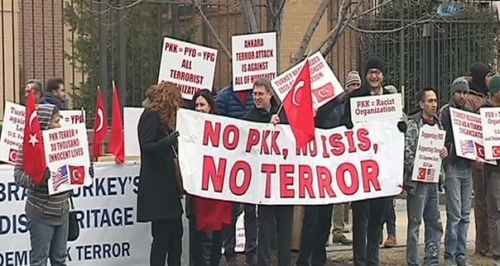 ABD’nin farklı eyaletlerinde yaşayan Türk vatandaşları, çarşamba akşamı Ankara’da gerçekleştirilen terör saldırını kınamak üzere başkent Washington’da toplandı. Türkiye’nin Washington Büyükelçilik binası önünde bir araya gelen grup, PKK, PYD, YPG ve DAEŞ karşıtı sloganlar attı. Saygı duruşunda bulunan vatandaşlar, ardından da İstiklal Marşı’nı okudu. Grup, saldırıda hayatını kaybedenler için dua etti. MUSİAD'ın ABD Şubesi'nin Başkan Yardımcısı ve Türk- Amerikan Dernekleri Yönlendirme Başkanı İbrahim Uyar, ABD’nin belli yerlerinde yaşayan Türkler olarak vatana, bayrağa sahip çıkmak için toplandıklarını kaydederek, “Şehitlerimizin anmak, vatanımızın başı sağ olsun diye ABD’nin başkentinden Türkiye’ye destek olmak için bir araya geldik.