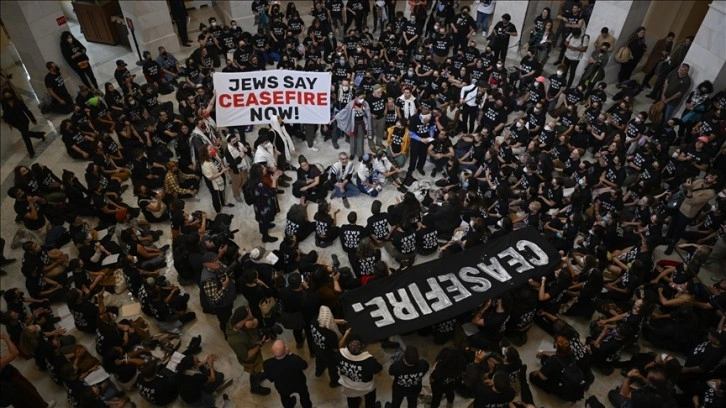 Paylaşımda, "Yüzlerce Amerikalı Yahudi Kongre'de oturma eylemi düzenliyor ve Gazze'de ateşkes çağrısı yapana kadar Kongre'den ayrılmayacağız. Binlerce ABD Yahudisi dışarıda protesto ederken, aralarında iki düzine hahamın da bulunduğu 350'den fazla kişi içeride dua ederek direniş gösteriyor." ifadelerine yer verildi.