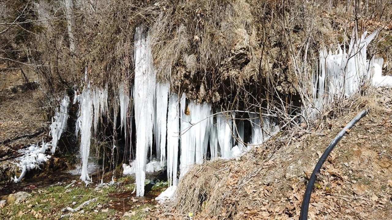 Tabiat parkı içinde yer alan şelalenin bazı noktalarında buz sarkıtları oluştu.