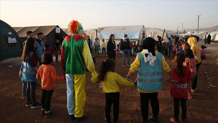 Palyaço kıyafeti giyen gönüllüler, müzik eşliğinde çocuklarla oyunlar oynayarak depremin olumsuz etkilerini bir nebze de olsa unutturmaya çalışıyor.