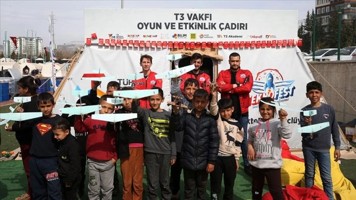 Çadırda düzenlenen atölyelerde maket uçak yapımını öğrenen çocuklar, bunları uçurmanın sevincini yaşadı.