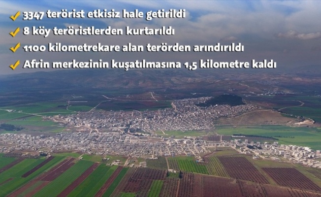 TSK ve operasyonlara destek veren ÖSO güçleri, harekatın başından bu yana YPG/PKK-DEAŞ'ın işgalindeki Afrin'de 5'i belde merkezi, 159'i köy ve 33'ü kritik nokta olmak üzere toplam 197 bölgeyi kontrolü altına aldı.