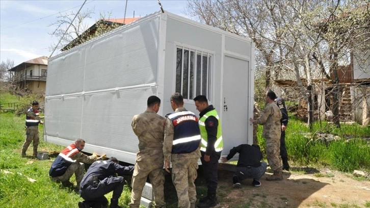 Anzorey Mahallesi'nde evleri ağır hasar alan depremzedelerin barınma sorununu çözmek için başlatılan çalışmalar kapsamında katlanabilir konteynerlerin kurulumu Afşin İlçe Jandarma Komutanlığı ekiplerince yapılıyor.