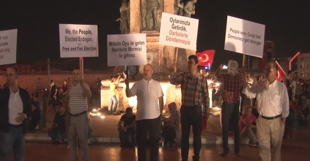Darbe girişiminin ardından yurt genelinde meydanlarda demokrasi nöbetleri sürerken Amerika ve İstanbul’da yaşayan bir grup akademisyende darbe teşebbüsüne tepki göstermek amacıyla Taksim Meydanı’nda bir araya geldi. ‘Oylarımızla getirdik, Darbelerle Göndermeyiz ‘ , ‘Milletin Oyu İle Gelen Hainlerin Mermisi İle Gitmez’ yazılı dövizler taşıyan grup darbe teşebbüsünü lanetledi.