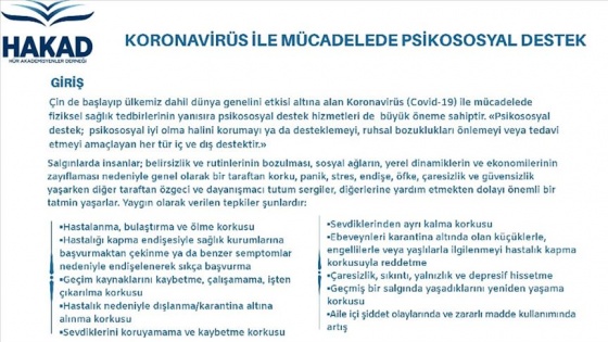 Hür Akademisyenler Derneği (HAKAD), yeni tip koronavirüs (Kovid-19) tedbirler kapsamında evlerinde kendi izole ortamlarını oluşturan vatandaşların, çeşitli sorunlarla mücadele edilebilmesi amacıyla çalışma başlattı.