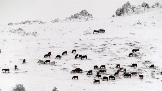 Akdağ ve Kumalar dağlarında kar üstünde yiyecek arayan yılkı atları görüntülendi