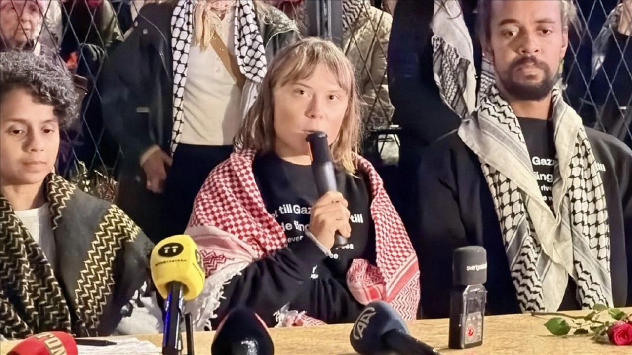 ????Burada konuşan Thunberg, "İsveç Konsolosluğu'ndan gelen kişilere (İsrail'de hapiste) kaldığımız süre boyunca 'temiz içme suyuna erişimimiz yok' dedik. Çünkü su kirliydi ve hastalandık." dedi.