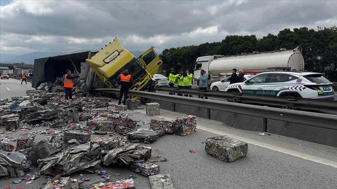 Otoyolun Kartepe geçişi Tepetarla mevkisi İstanbul istikametinde Mustafa Ö. idaresindeki 42 ARN 516 plakalı hurda yüklü tır, refüje çarparak devrildi.