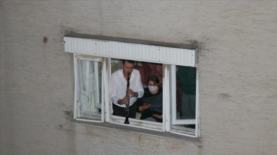 Sokağa çıkma kısıtlamasının başladığı saatlerde enstrümanlarıyla evlerinin balkonuna çıkan Barış Özkaya ve annesi, mahalle sakinlerine bir saat boyunca konser veriyor.