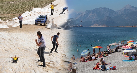 Konyaaltı sahilinde plajları dolduran tatilciler, şezlonglarda güneşlendi, sahilde yürüyüş yaptı. Aileleriyle suda eğlenen çocuklar renkli görüntü oluşturdu.