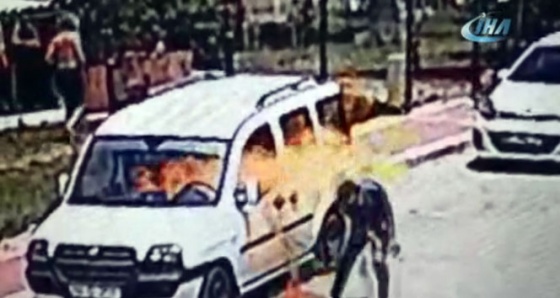 Sitenin güvenlik kamerasına yansıyan görüntüler ise, kasklı şekilde aracın yanına gelen F.T. geri dönüp motosikleti aracın önüne parketti. Koltuğun altından kaldırım taşı ve küçük benzin şişesini alan F.T. aracın kelebek camını kırdı. İçeri benzin döken F.T. çakmağı çakması aracı alevlerin sarması bir oldu. Kendisi de yanmaktan son anda kurtulan F.T., balkondan kendisini gören kişiyi tehdit ettikten sonra olay yerinden ayrılışı saniye saniye kaydedildi.