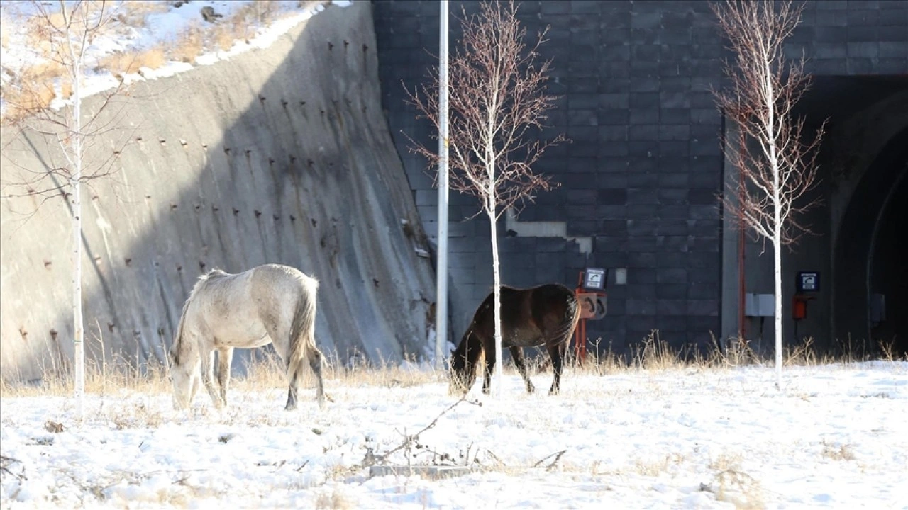 Doğada özgür yaşayan yılkı atları, yiyecek bulmak amacıyla Çıldır-Aktaş Gümrük Kapısı'na geçişi sağlayan Aşık Şenlik Tüneli girişine geldi.