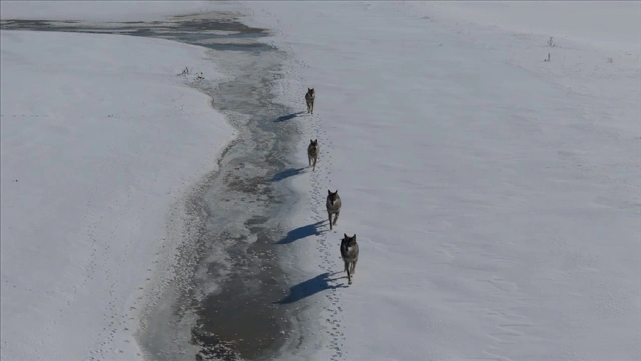 Dereyolu köyü yakınlarında yiyecek arayan 4 kurt, AA ekibi tarafından dronla görüntülendi.