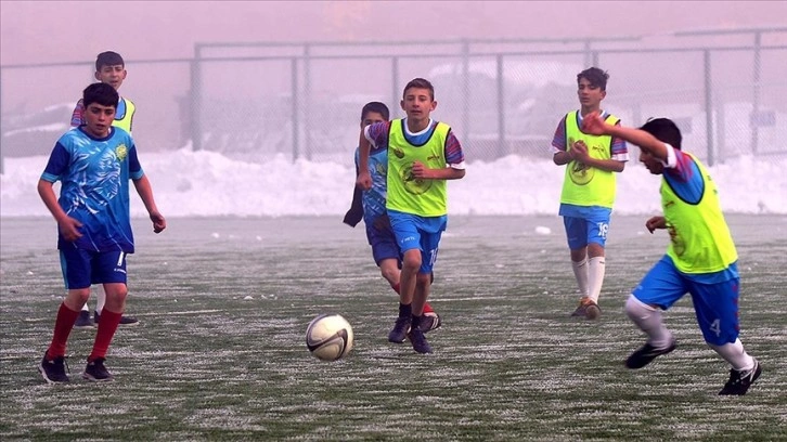 Sis ve soğuk havaya rağmen Şehir Stadyumu'nda bir araya gelen çocuklar, kırağı tutan zeminde futbol oynadı.